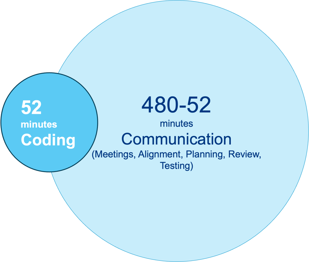 The average developer spends about 480 – 52 = 428 minutes per day communicating and only 52 minutes coding.