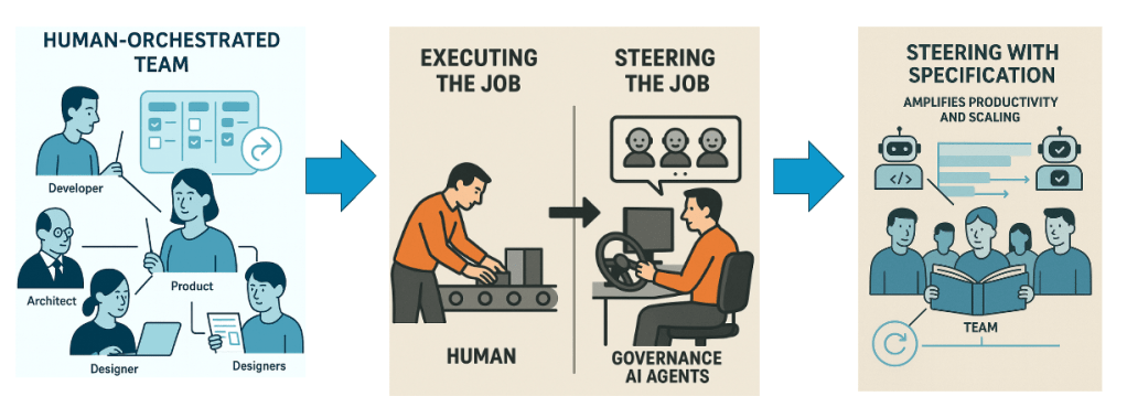 - Code & Validate: AI agents generate the production code based on the tasks and specifications, and both humans and automated tests validate the outcome against the original spec.