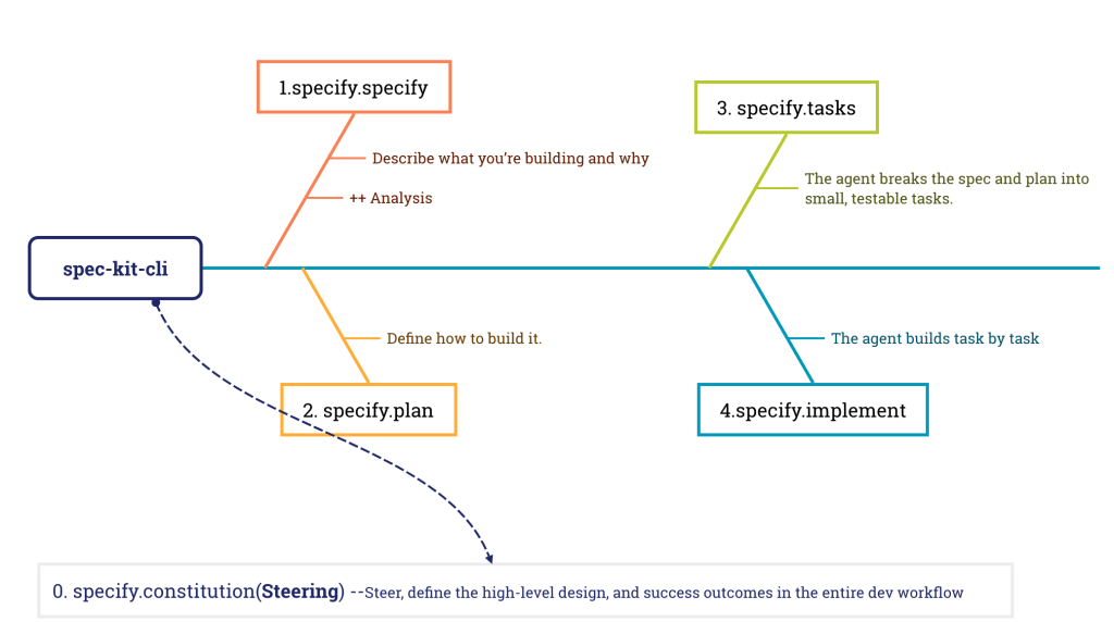 - Specify: A human provides a high-level description of the feature or product, and an AI agent generates a detailed, structured specification that captures the intent, behaviors, and requirements.