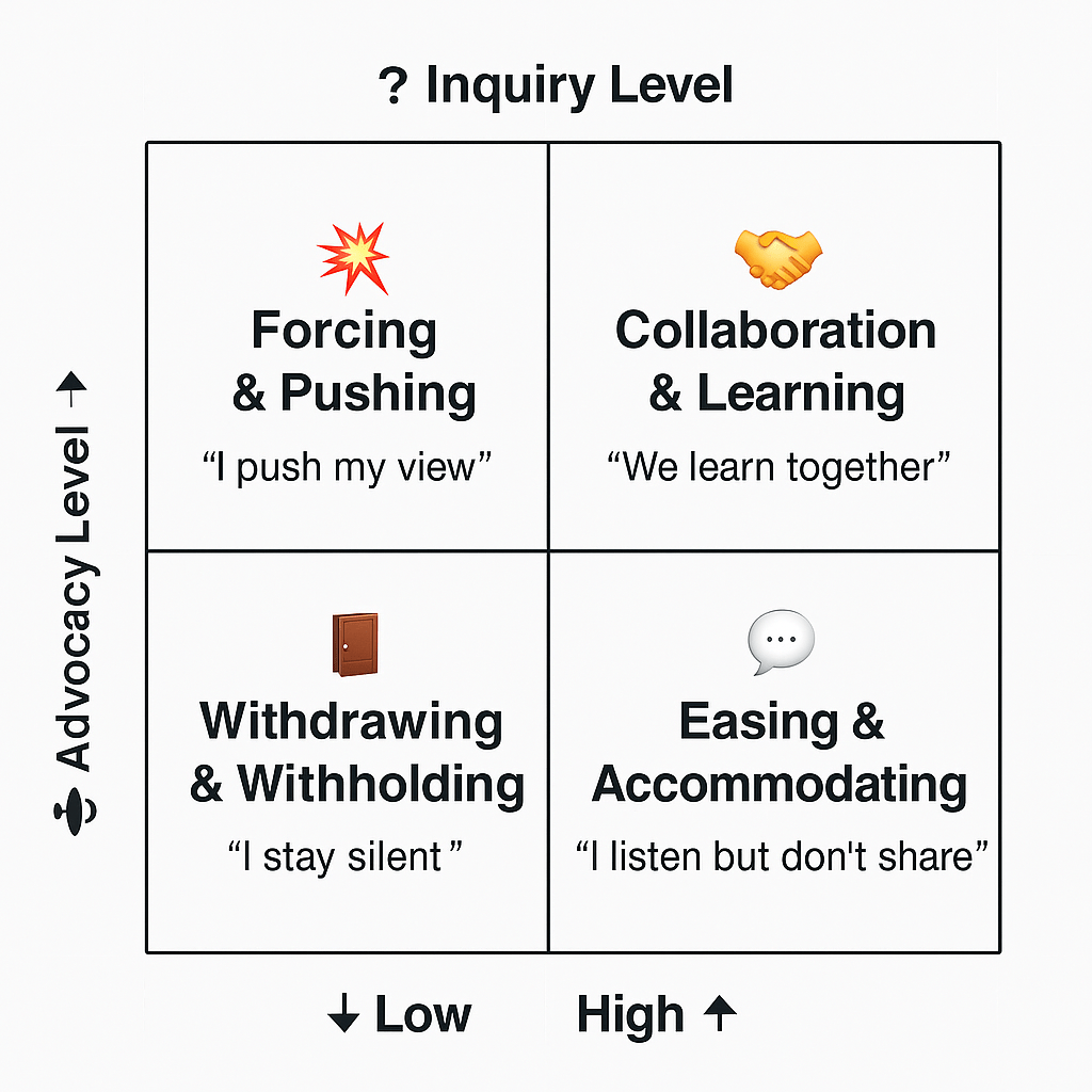 | 🧮 Advocacy vs. Inquiry Matrix | High + High → 🤝 Collaboration & Learning High + Low→ 💥 Forcing Low + High → 🕊️ Accommodating Low + Low → 🚪 Withdrawing | Balance words ⚖️ and questions ❓ for growth 🌱. |